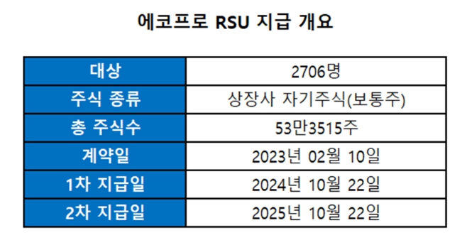 에코프로는 지난해 전체 RSU 중 절반을 지급하고, 이달 22일 기준으로 2차 RSU를 지급하기 위해 관련 절차를 밟고 있다.